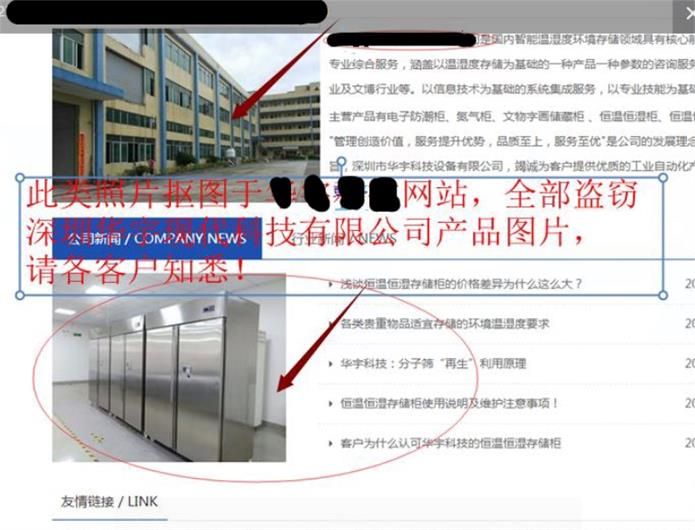 深圳市華宇現(xiàn)代科技有限公司擁有一項恒溫恒濕存儲柜國家發(fā)明專利,和多項相關(guān)的結(jié)構(gòu)新型及軟著專利。產(chǎn)品廣泛用于外資企業(yè),大企業(yè),企業(yè)集團,軍工,醫(yī)藥,博物館,檔案館。最近發(fā)現(xiàn)市面有很多貿(mào)易公司或五金生產(chǎn)廠家,在線下或網(wǎng)絡(luò)上盜用我司的產(chǎn)品資料及圖片進行不良銷售活動。更有甚者以華宇現(xiàn)代的品牌私下接單,但實際銷售的產(chǎn)品卻是不具備恒溫恒濕功能的非我司產(chǎn)品?。ɡ绾蜕钲谑腥A宇現(xiàn)代科技有限公司相似名稱來取名以混淆客戶,更有甚者,其網(wǎng)上全部圖片盜用華宇現(xiàn)代產(chǎn)品圖片,以蒙騙客戶(可以進入華宇現(xiàn)代官網(wǎng)www.skwork.com.cn比較即知))